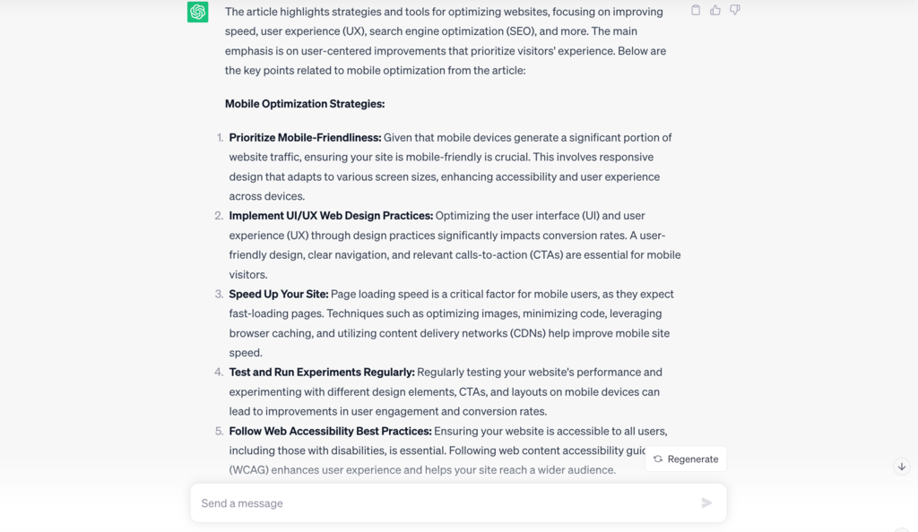 For example, “Summarize this article on website optimization, but only focus on strategies related to mobile optimization: [copy+paste article here].”