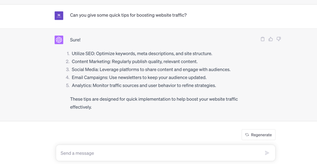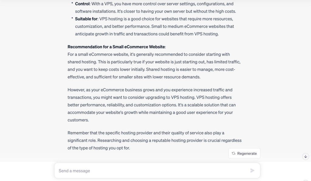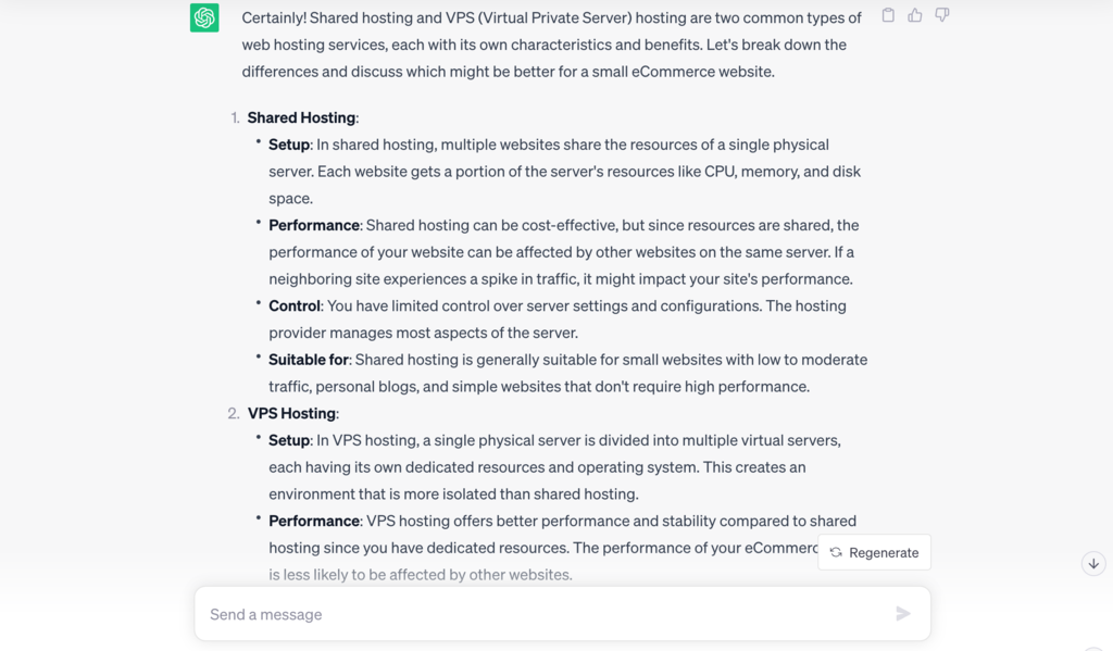 For this tutorial, let’s take this prompt as an example – “Can you explain the differences between shared hosting and VPS hosting and recommend which is better for a small eCommerce website?”