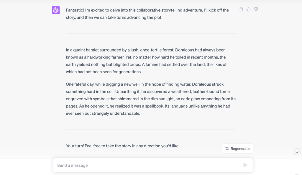 Collaborative storytelling goes a step further by letting the AI adapt to your inputs in real time. It allows for a back-and-forth exchange where you and the tool contribute to the unfolding story, creating an interactive and immersive experience.