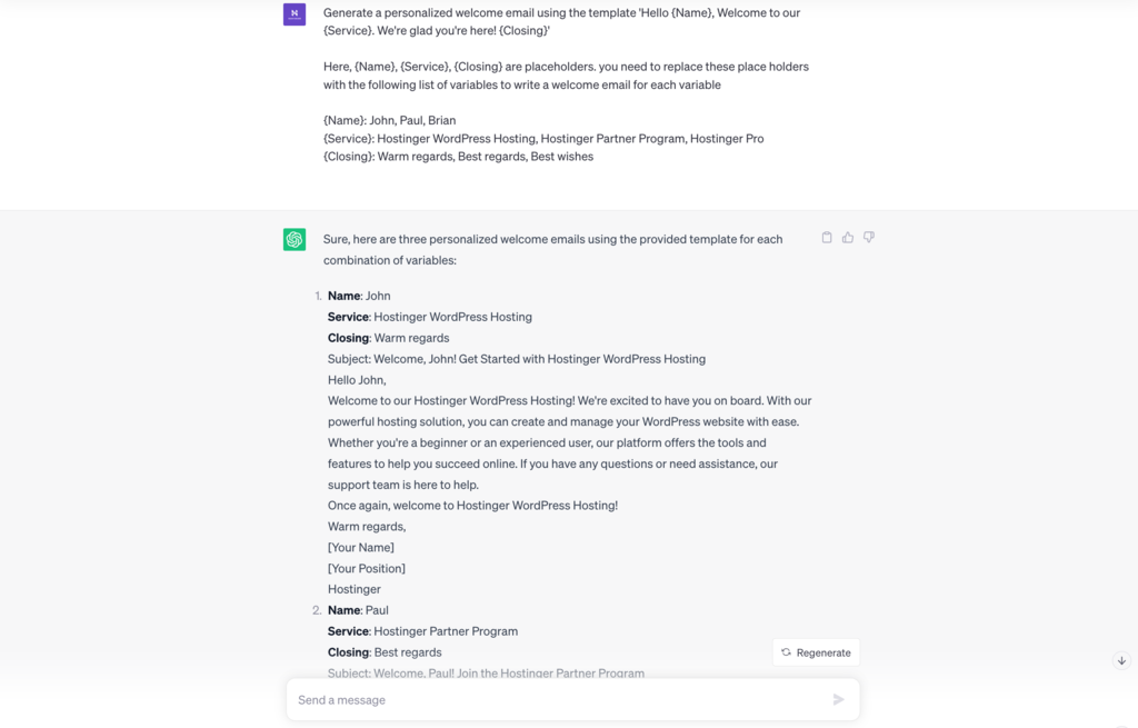 As an example, let’s take this prompt: “Generate a personalized welcome email using the template ‘Hello {Name}, Welcome to our {Service}. We’re glad you’re here! {Closing}'”