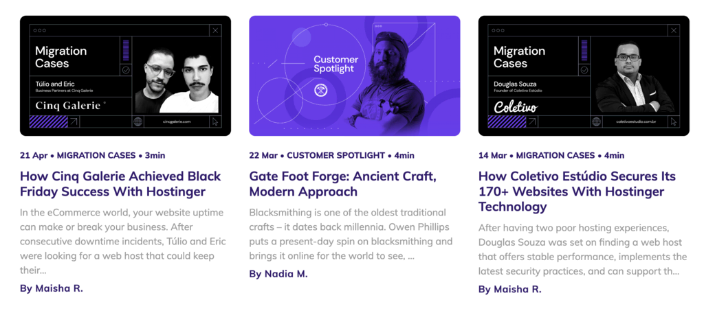 Hostinger Blog features numerous client stories on its website. It breaks down how customers achieve their goals using Hostinger’s web hosting services or how their business has improved since the website migration.