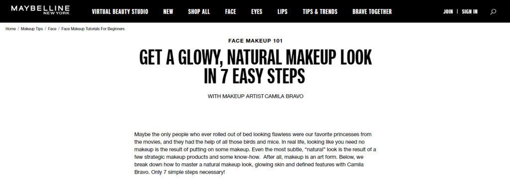 An example of this blog post type is the glowy and natural makeup tutorial article on the Maybelline website. It breaks down the process into several steps with product recommendations and high-quality images.