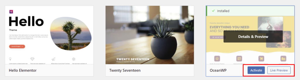 After the installation process is complete, you’ll see Live Preview and Activate buttons when you hover over the theme.
