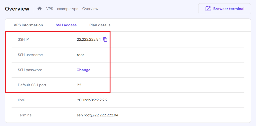 VPS hosting users can find similar information by selecting the SSH access tab from the VPS dashboard. Here, use the SSH IP, username, password, and the default port as your FTP login data.