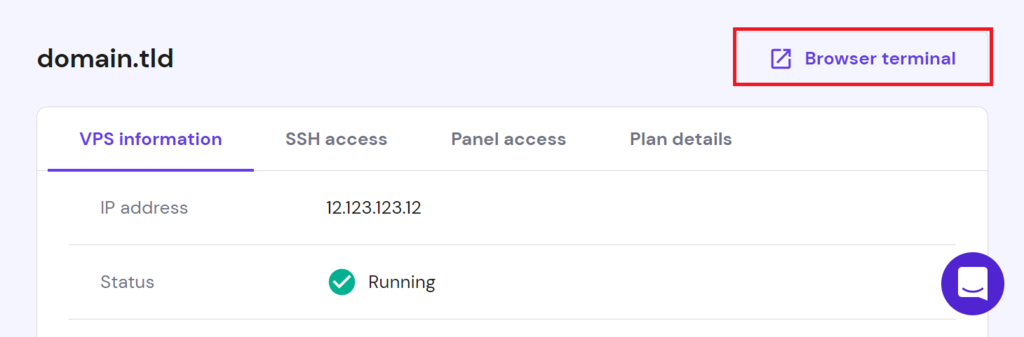 Alternatively, use hPanel’s built-in terminal, which users can use via web browsers. To access it, click the VPS you want to manage → OverviewBrowser Terminal.