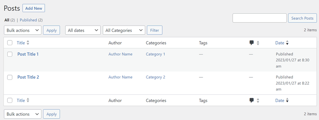 The Posts section in WordPress showing a list of published posts