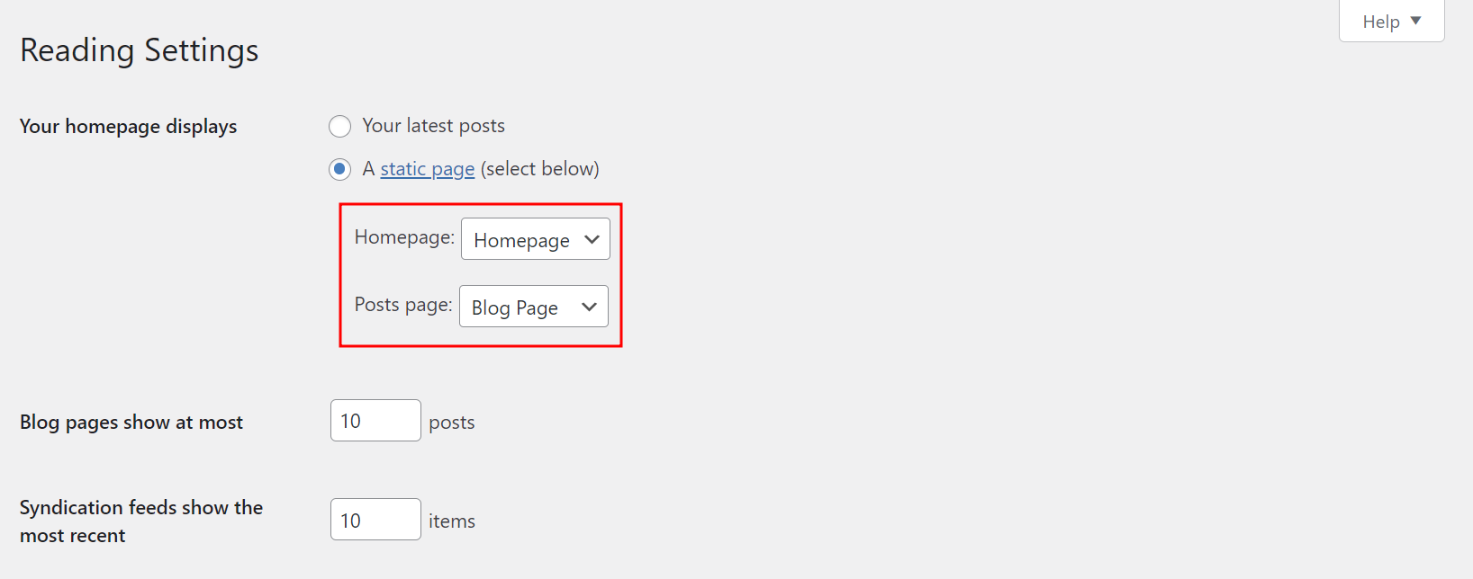 Don’t pick the same page for the Homepage and Posts page options to prevent errors.
