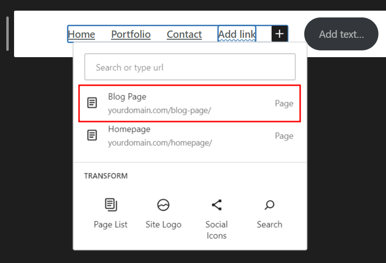 Next, add your custom homepage and blog page to the navigation menu: