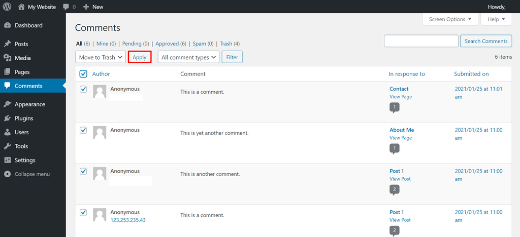 Under the Delete Comments settings, you have three options. Choose Everywhere if you want to delete all comments on your site.
