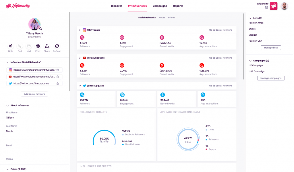 When selecting the influencers you will work with, ensure that their target audience aligns with yours. Use tools like Influencity and Upfluence to find suitable influencers for your business as these analyze influencers’ statistics and their audience demographics across social platforms.
