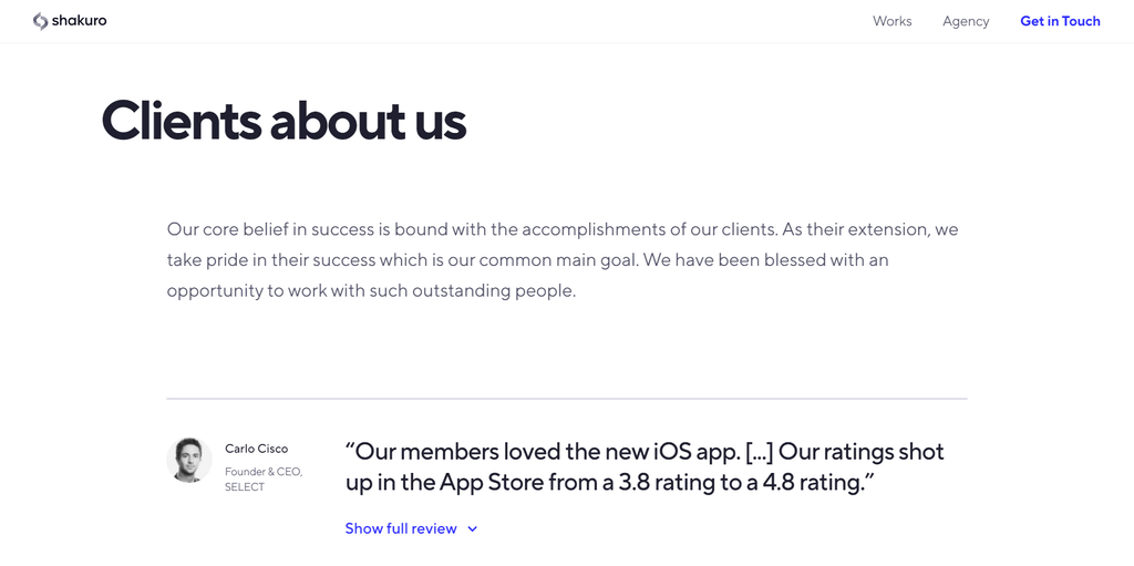 To maximize the benefit, make sure to place client reviews strategically. For instance, PopArt Studio displays them on its homepage, while Shakuro creates a Testimonials page and links it on the website footer.