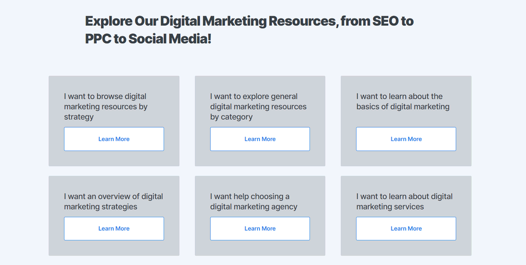 Take a look at WebFX as an example. This digital marketing and web development company categorizes its knowledge base into seven topics based on its services and uses casual language for the titles.