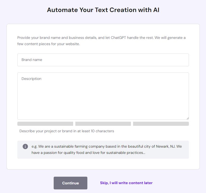 Hostinger users on Business and cloud website hosting plans can set up their new WordPress website during the onboarding flow. With the built-in AI tools for fast content creation, this method is geared toward beginners and those wanting to launch their site quickly.