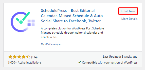 1. From your WordPress dashboard, head to Plugins -> Add New and search for SchedulePress. Click Install Now and Activate to start using the plugin.