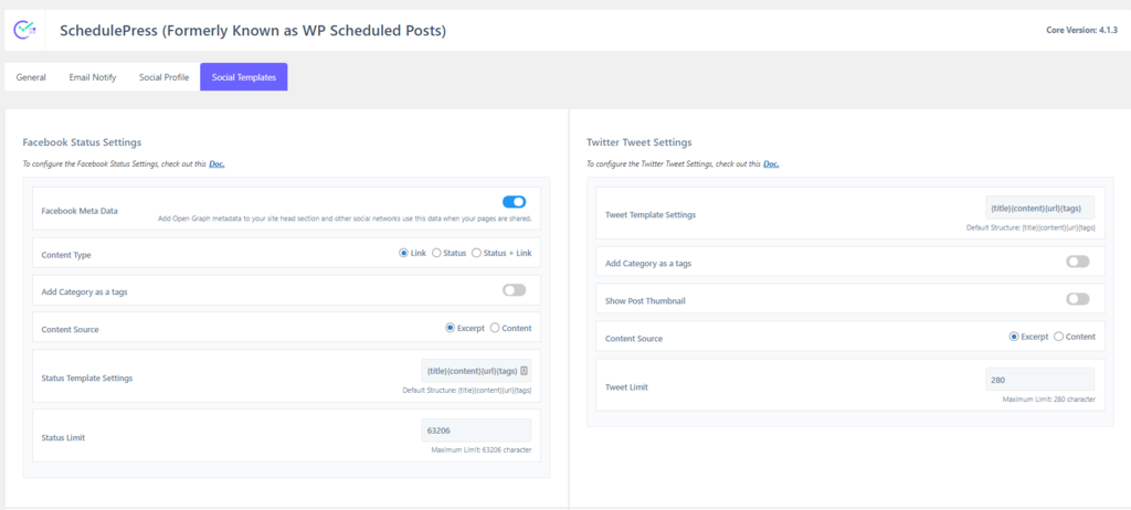 Then, click on the Social Templates section to configure the settings for your social media posts. Select the Content Type and Source, then edit the Status Template Settings accordingly. The default structure contains the title, content, URL, and tags.