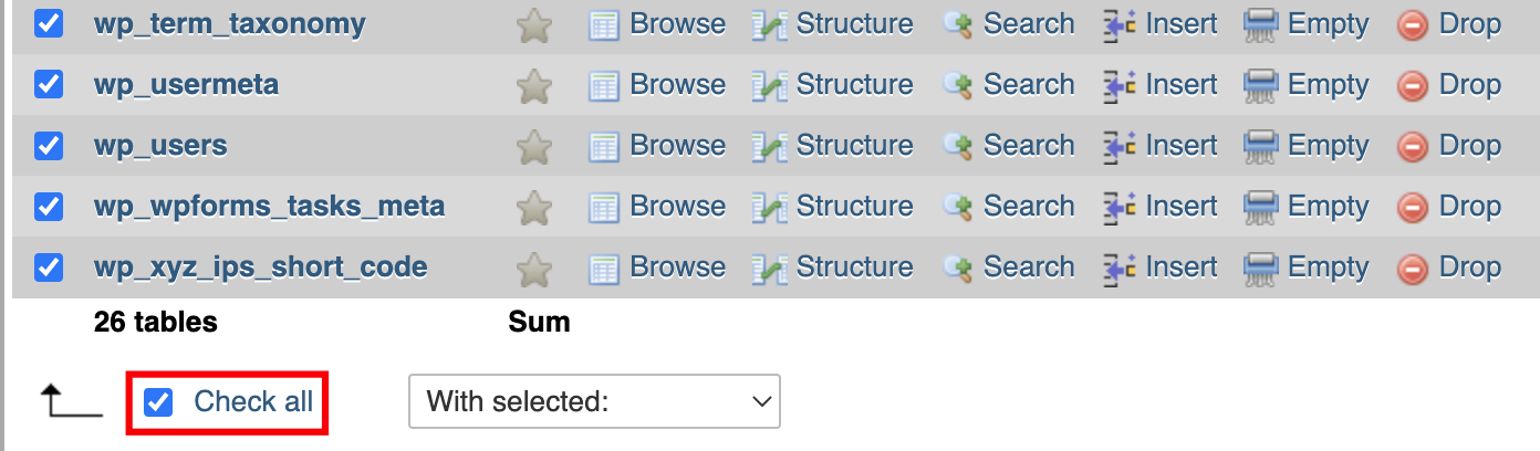 This article should be updated. There is no need to manually rename all tables with new prefixes. 1. Open your database in PhpMyAdmin. 2. Click on the database name in the menu to the left to unfold all tables. 3. Select all tables that start with wp_; you should have 12 in total. 4. Click With selected to open the drop-down menu and select Replace table prefix. Type in wp_ in the From-field, and the new name in the To-field, in this example, hostinger_. Click Continue to make the change.