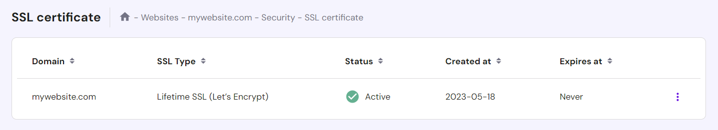 Most hosting companies include SSL with their plans. Hostinger, for example, provides free lifetime Let’s Encrypt SSL certificates on all its WordPress hosting plans. Our users can check their SSL status via Websites → Security → SSL from the hPanel dashboard.