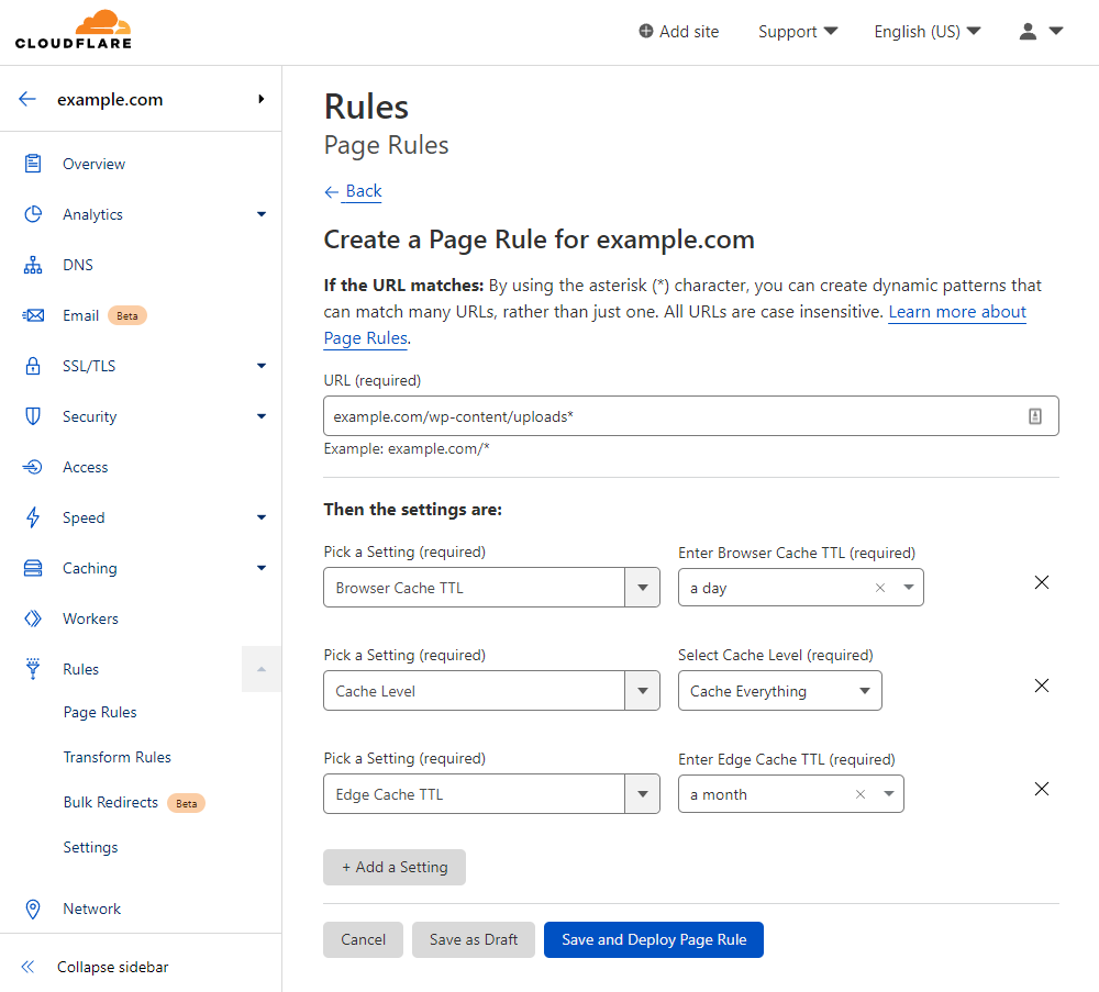 Here are the steps to set up Cloudflare page rules: