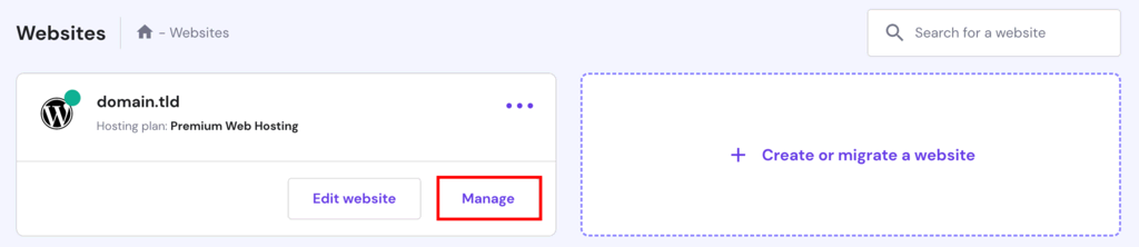 • Log in to hPanel and navigate to Websites. Select the site you want to upload your image to and click on Manage.