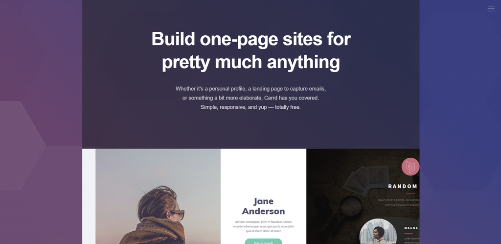 Carrd is one of the notable customizable website platforms for building one-page personal websites. Start with a responsive template or craft your own with the drag-and-drop editor.