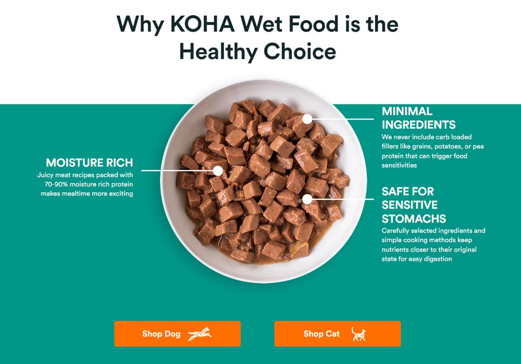 If you’re particularly interested in eCommerce StoryBrand website examples, you might want to check out Koha Pet. The problem this brand presents is that some pets don’t thrive on dry-food-only diets. Koha Pet promises to solve that by offering healthy wet food they’ll love.