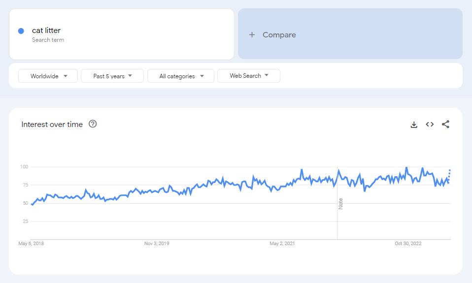 Google Trends data shows that the search volume for cat litter has always been high, but it has also been experiencing a gradual increase in recent years and reaching new heights. It is projected to remain high throughout 2023.