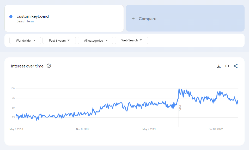According to Google Trends, the search term “custom keyboard” has steadily increased in popularity. The search volume experienced its most dramatic increase at the beginning of 2022. It remains high throughout the ensuing months.