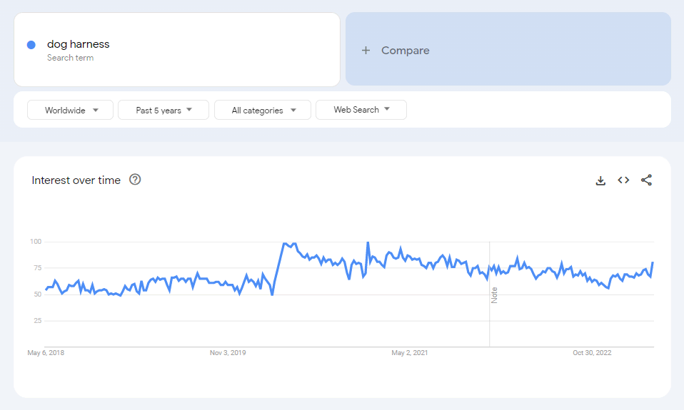 According to Google Trends, the search volume for “dog harness” increased significantly in 2020. It experienced a slight drop in December 2022, but the numbers have recovered since. Interest in this pet product is expected to remain high throughout 2023.