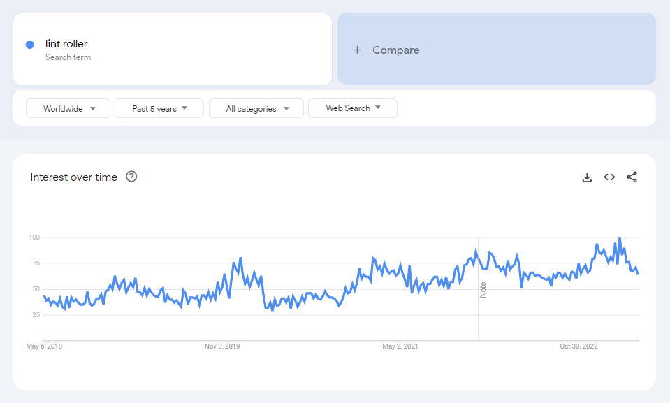 According to Google Trends, searches for “lint roller” had fluctuated in the past, but they started to experience a gradual upward trend since the beginning of 2020. The search volume continued to increase until it peaked in March 2023.