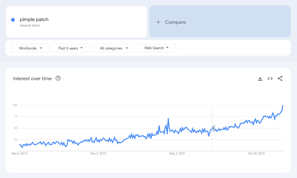 The global search volume for “pimple patch” has experienced a steady increase over the past five years. It is projected to reach an all-time high in May 2023. The search volume shows no signs of dropping any time soon, making it an excellent product to sell.