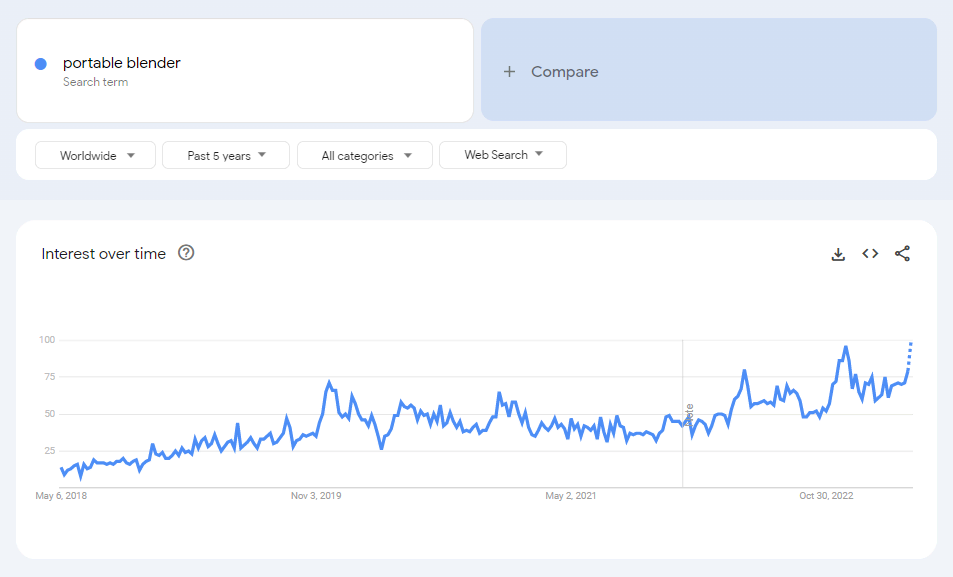 These blenders are among the most popular items in the kitchen appliance product category. Google Trends shows that searches for “portable blender” have increased over the years and will remain popular going into 2023. The search volume reached its highest peak in December 2022.