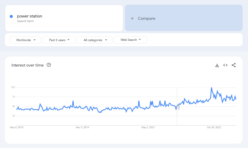 According to Google Trends, the search volume for “power station” stayed relatively high and stable in recent years, even before its dramatic increase in September 2022.