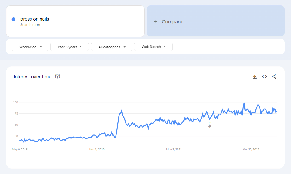 This is one of the fastest-growing trending beauty accessories. Looking at Google Trends, search interest in press-on nails has increased substantially in recent years, especially after a dramatic increase in March 2020. It reached its peak in September 2022 and will remain high throughout 2023.
