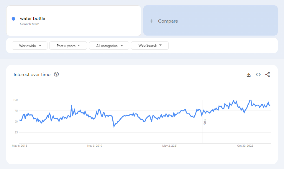 The search volume for “water bottle” on Google Trends has been increasing steadily. It reached its highest point in December 2022 and will remain high in 2023.