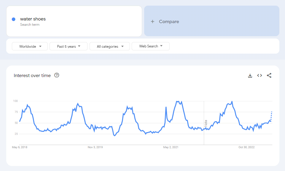 On Google Trends, the search interest for the term “water shoes” rises and falls periodically, usually experiencing a spike during the summer months – April to August. This is likely due to the warm weather, which means an increase in water sports activities.