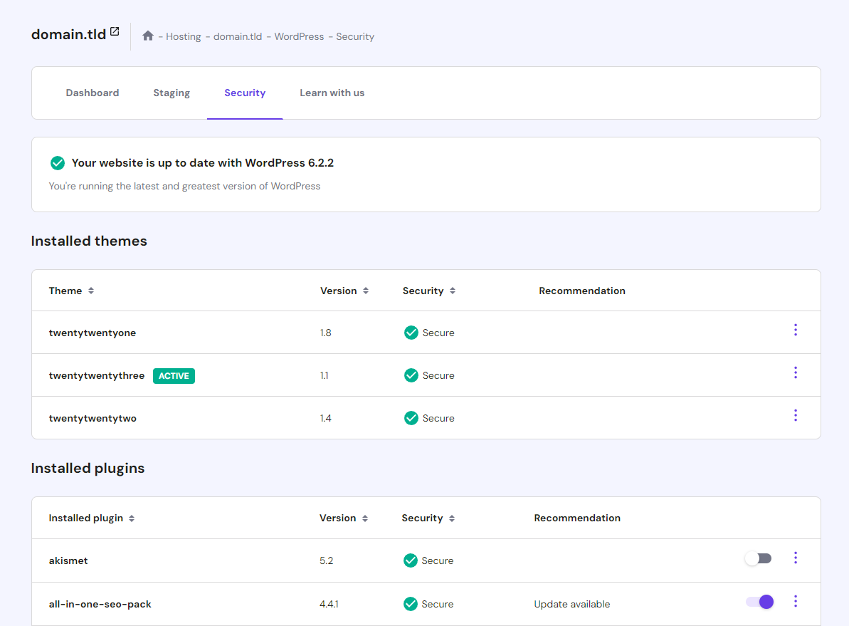 Hostinger, for instance, offers free SSL certificates, an automatic malware scanner and removal tool, and a vulnerability checker for plugins and themes.
