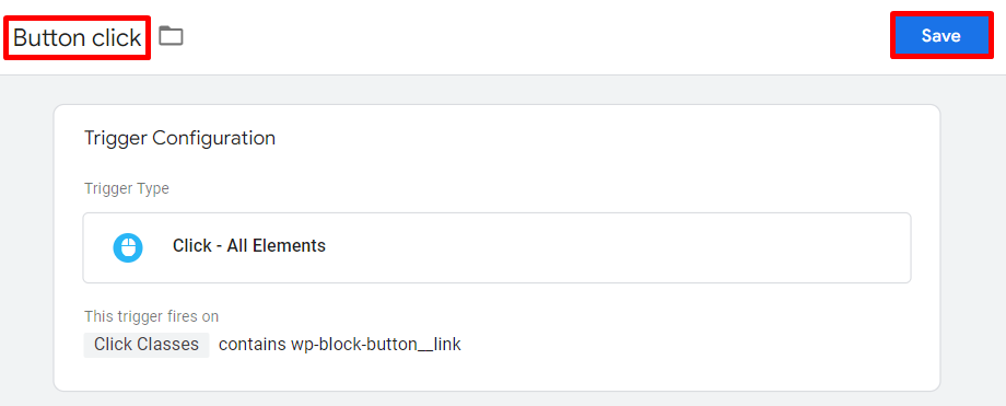 Choose the Custom Event trigger type and enter the event name. Use the exact name in the data layer without the quotes. In this case, we will use view_search_results. Then, name the trigger, for example, “Custom event – Search”. Finally, click Save.