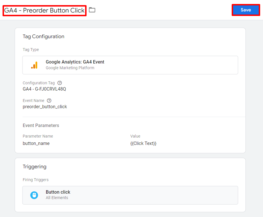 Then, name the tag and click Save. As an example, we will call it GA4 – Search.