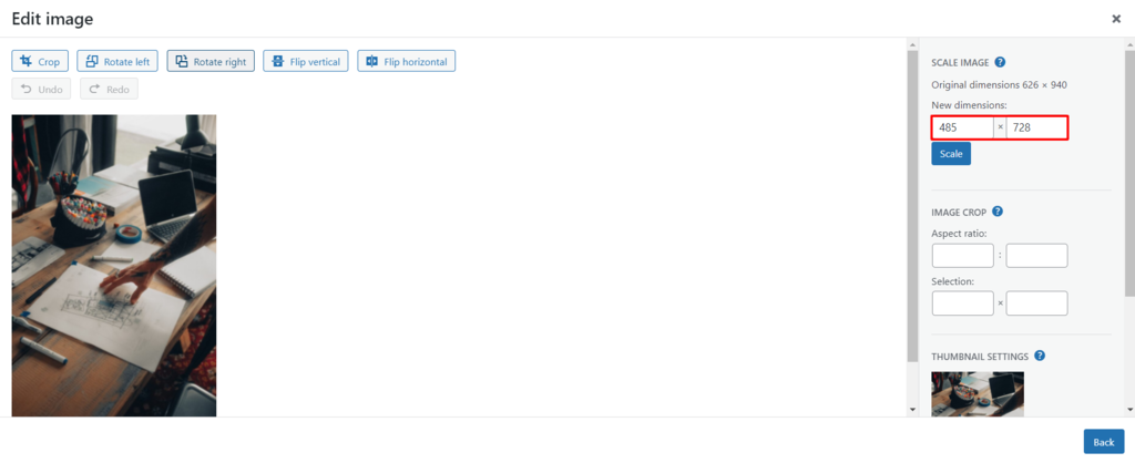 On the post, click the image you want to scale. Select Replace -> Open Media Library.