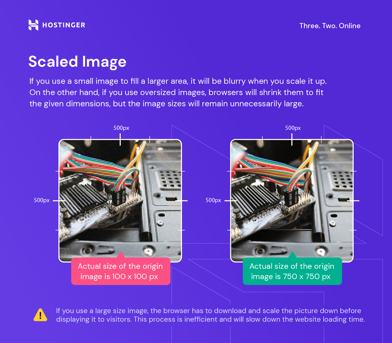 For example, if you use a 500 x 500 px image for a 50 x 50 px thumbnail, the browser has to download and scale the picture down before displaying it to visitors. This process is inefficient and will slow down the website loading time.