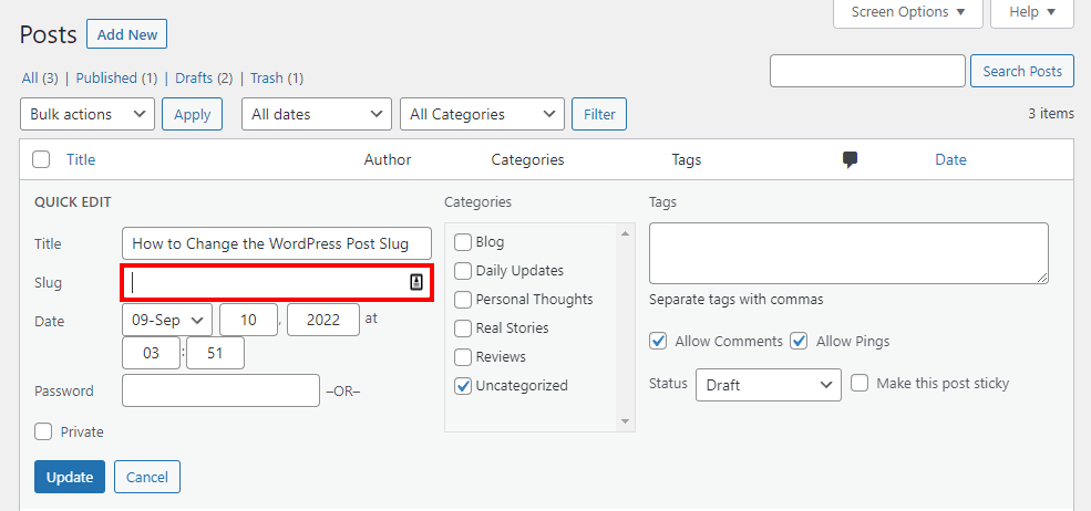 Another option is to change your post slug using the WordPress dashboard’s Quick Edit feature: