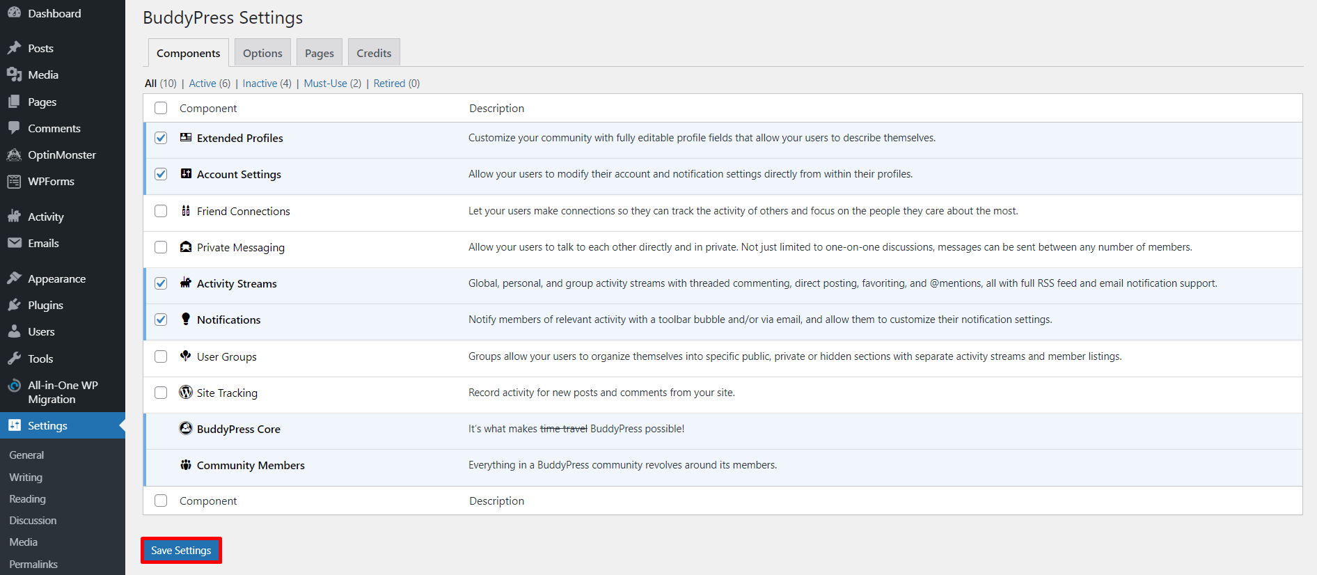 In the Components section, tick the box of any feature you want to enable and click Save Settings when done.