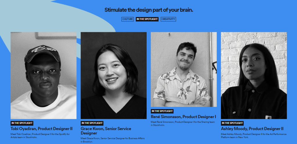 For example, Spotify Design highlights one employee every few months through its In the Spotlight posts. Each employee answers questions related to their position and experiences working at the company.