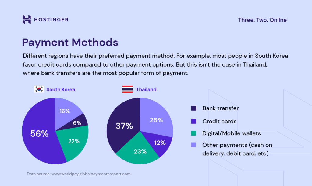 However, be informed that payment methods’ popularity varies by region. For example, most people in South Korea favor credit cards over other payment options. Meanwhile, bank transfers are the most popular payment form in Thailand.