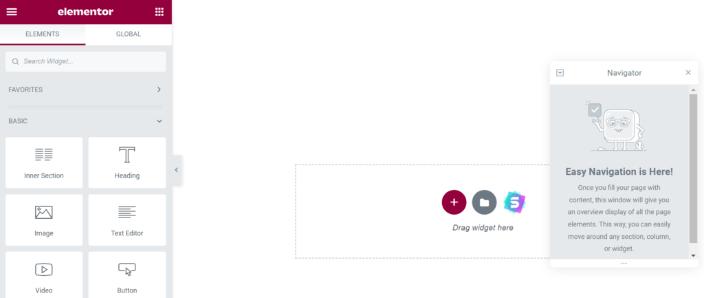 This page builder’s interface has two main parts. On the left, you will find Elementor’s editing navigation panel allowing quick access to different widgets from the basic, pro, and general categories.