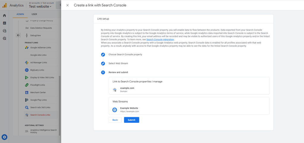 1. On Google Analytics, go to Admin Product Links Search Console Links.