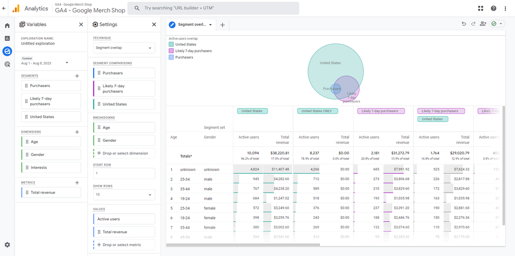 Using Segment overlap exploration on Google Analytics 4 to compare actual purchasers, predicted purchasers, and US buyers