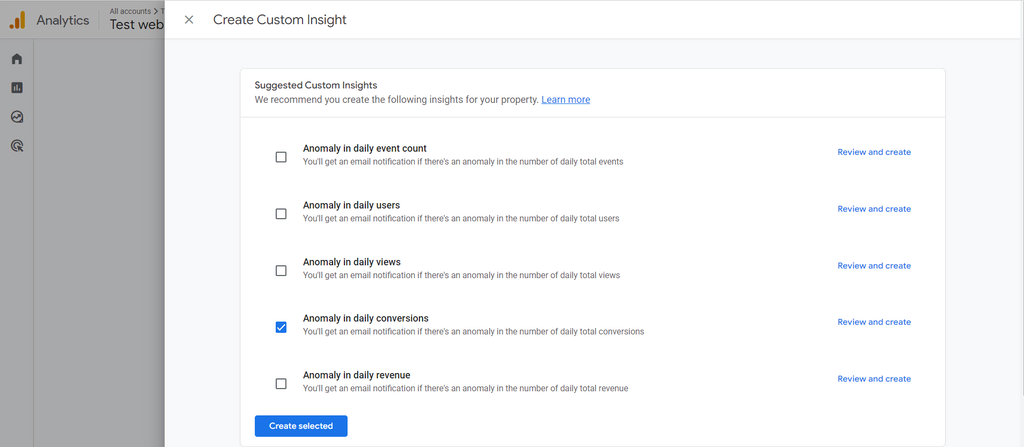 2. Here, use the suggested custom insights called Anomaly in daily conversions, and press Create selected.