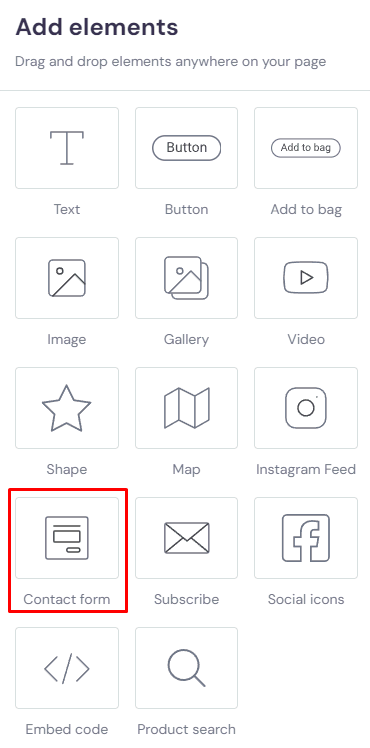 Set up a registration form for potential attendees and manage the list seamlessly. Use Hostinger Website Builder’s contact form to collect data. Go to Add elements and click Contact form. To further streamline the check-in process and enhance attendee management, consider using QR codes for events either for registrations or tickets.