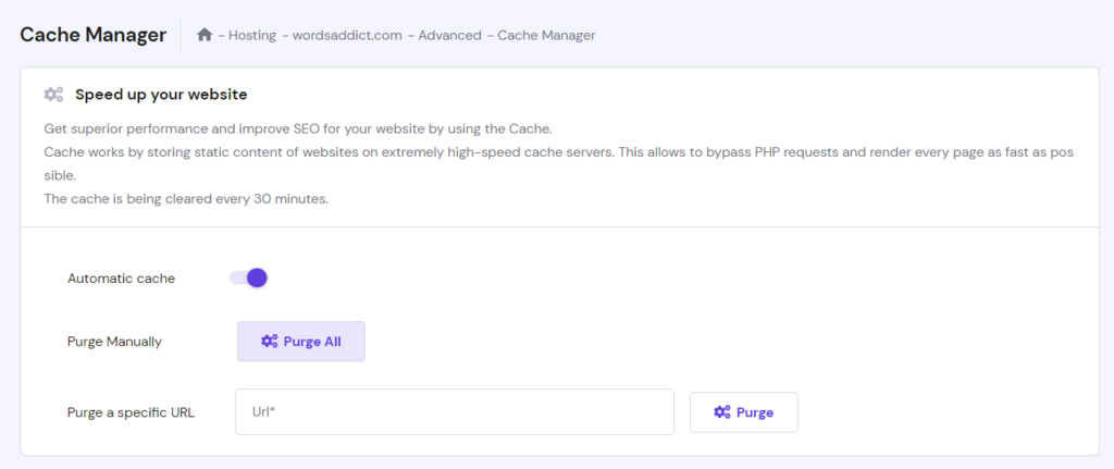 For Hostinger users, the Cache Manager feature on hPanel can automate the process every 30 minutes. To enable this functionality, follow these steps: